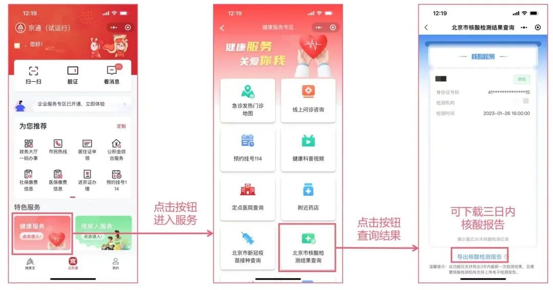 公众在任意检测点完成核酸检测后,如检测结果为阴性,可登录“京通/北京健康宝”小程序,在“健康服务”—“北京市核酸检测结果查询”功能模块下载三日内最近一次中英文核酸检测报告。该系统通过将全市统一核酸检测系统、各实验室自建系统的数据汇聚后,集中生成中英文报告,同时借鉴了冬奥离境人员核酸检测报告的制式模板,以最大程度满足各个国家需求。