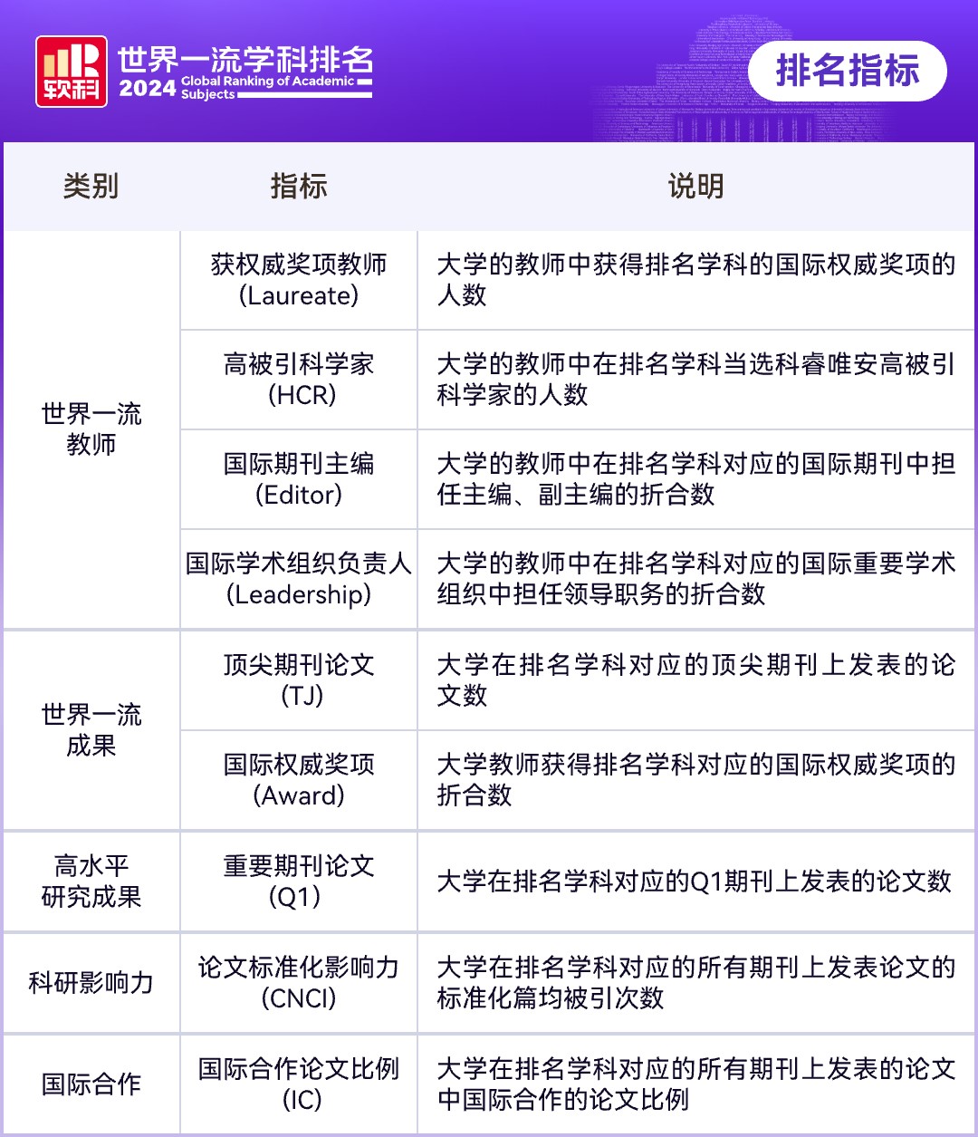 2024软科世界一流学科排名采用五个模块九项国际可比的客观学术指标,衡量全球大学在各个学科的学术竞争力。