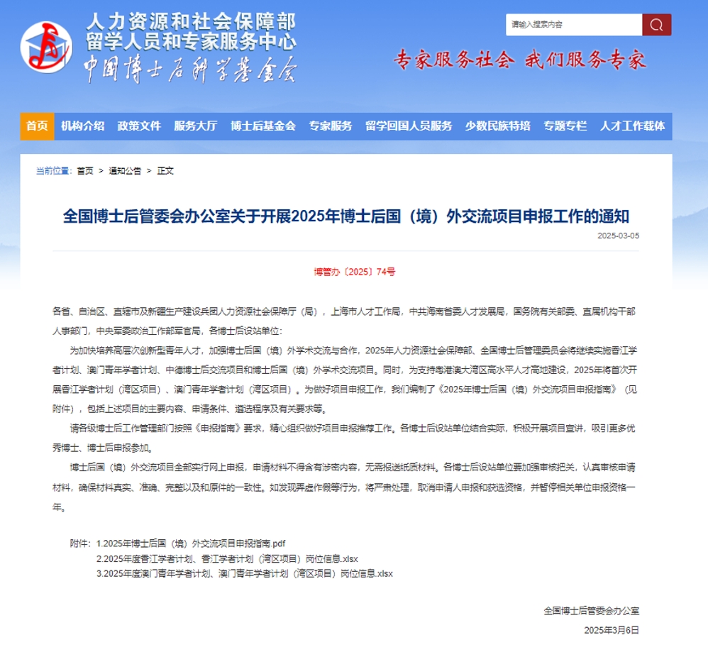近日,全国博士后管委会办公室官方网站发出了2025年博士后国(境)外交流项目申报指南,包括香江学者(含湾区项目)、澳门青年学者(含湾区项目)、中德博士后交流项目和博士后国(境)外学术交流项目(以下简称“学术交流项目”)。本期知识人网小编概括介绍这六大项目。