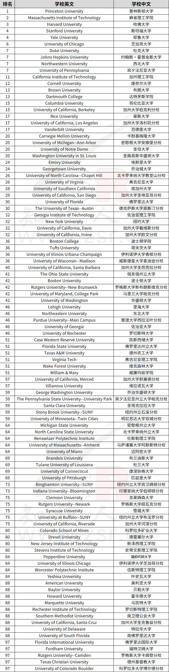 下面是2026年U.S.News美国综合大学前100的榜单