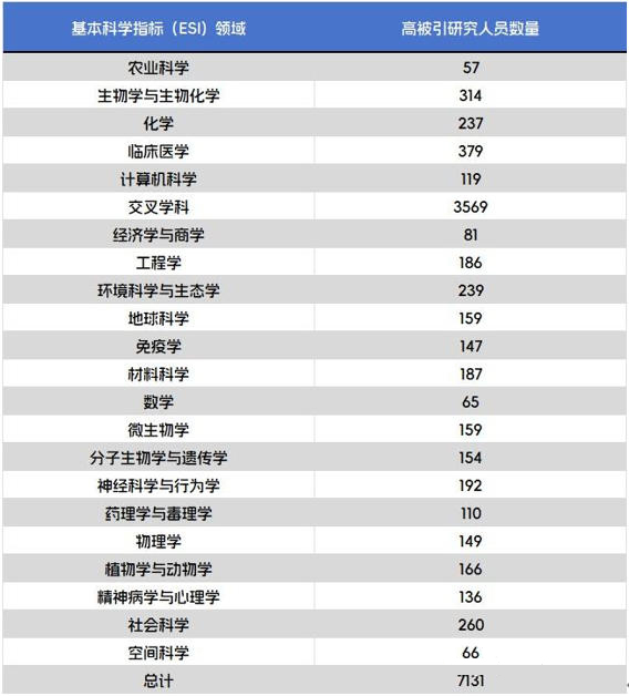 在21个基本科学指标(Essential Science Indicators)学科中,共有3562人次入选,其中227人同时入选两个及以上学科,31人同时入选三个及以上学科,他们的学术成果在多个学科领域具有广泛影响。由于一些科学家在一个以上ESI学科入选,因此总人次数(7131)超过了入选科学家总人数。