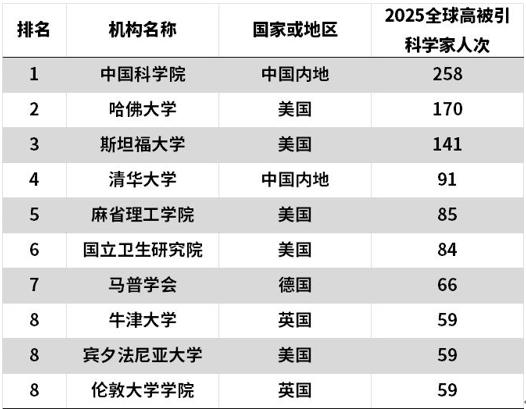 2025年度全球高被引科学家上榜人次前十的机构