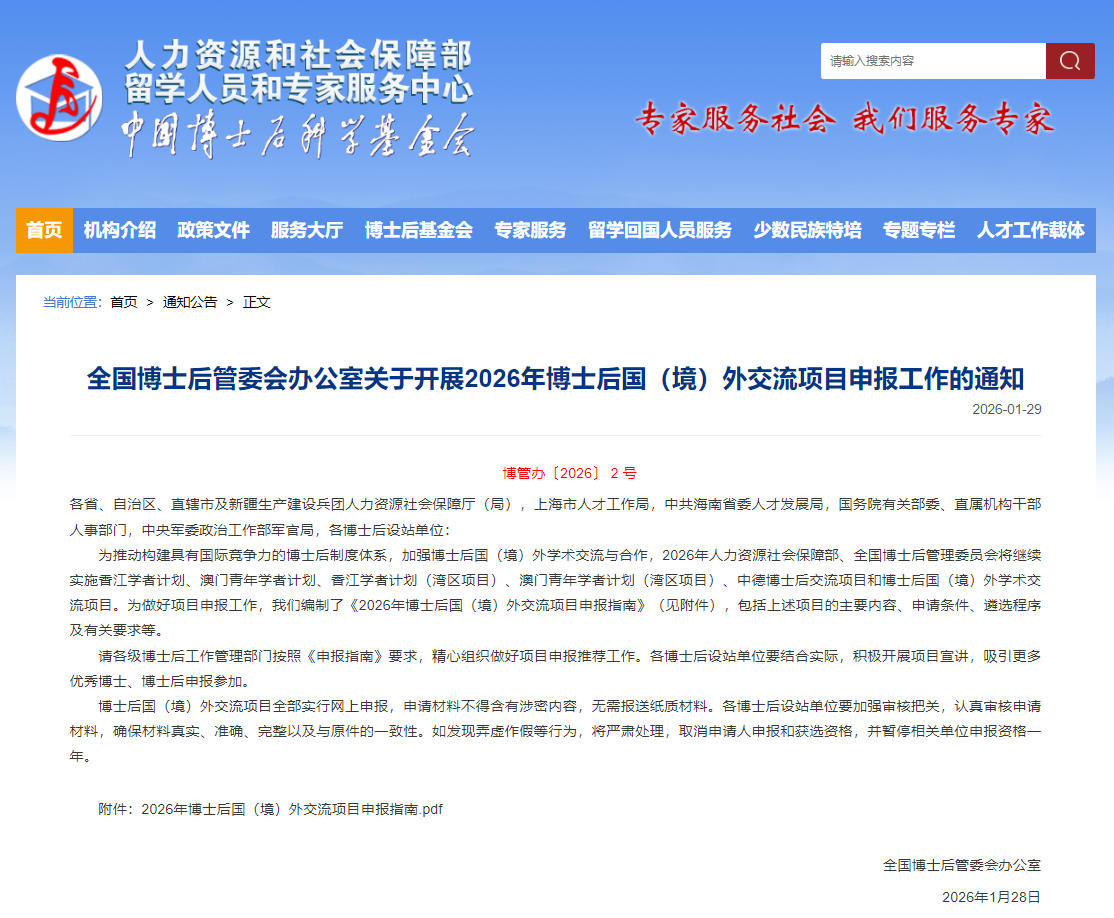 近日,全国博士后管委会办公室官方网站发出了2026年博士后国(境)外交流项目申报指南,包括香江学者(含湾区项目)、澳门青年学者(含湾区项目)、中德博士后交流项目和博士后国(境)外学术交流项目(以下简称“学术交流项目”)。本期知识人网小编全文转载,供拟申请者参考。